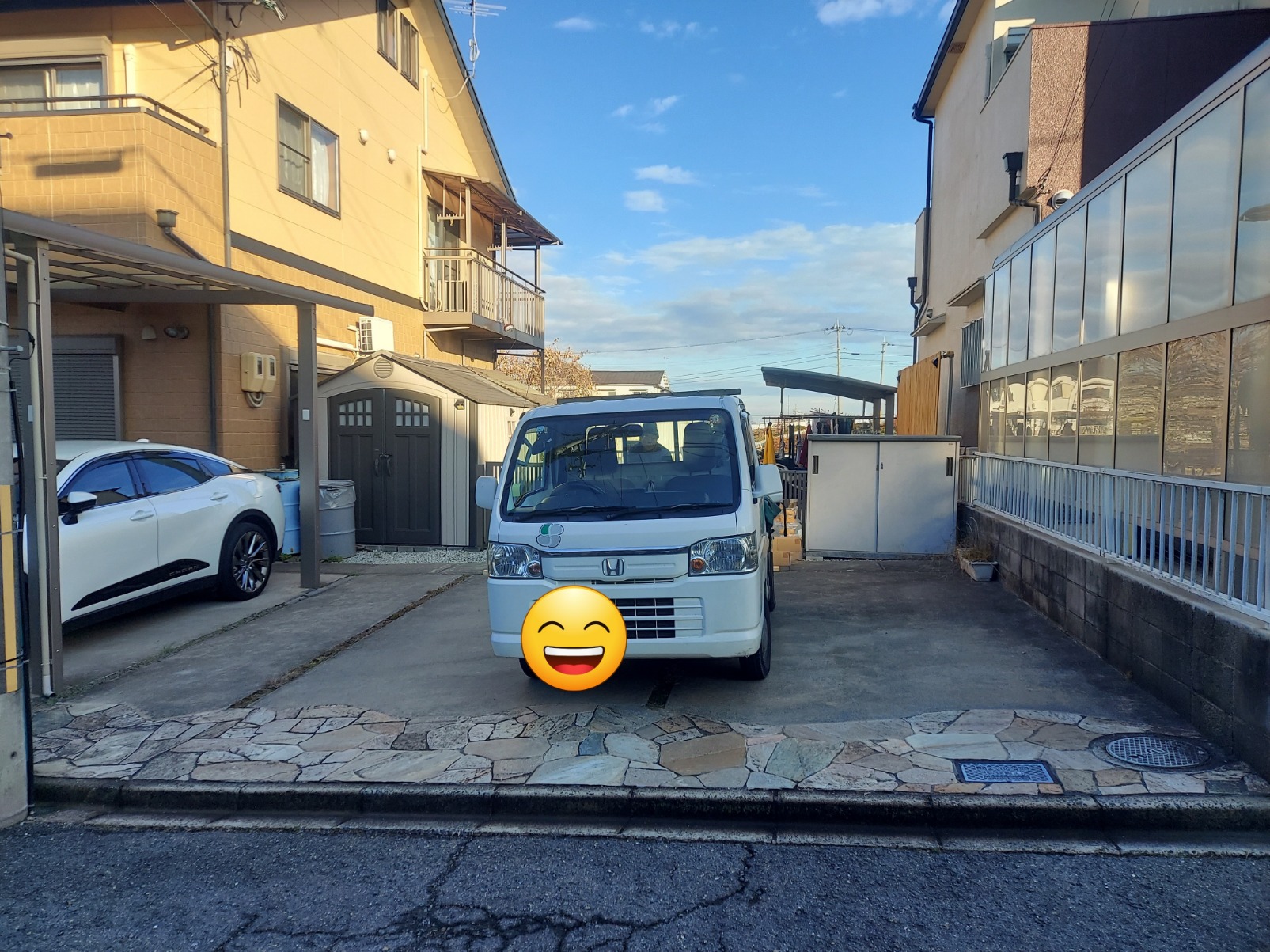写真の裏に少し見えます、自転車置き場の屋根も含め、外構工事全般をさせて頂いております。