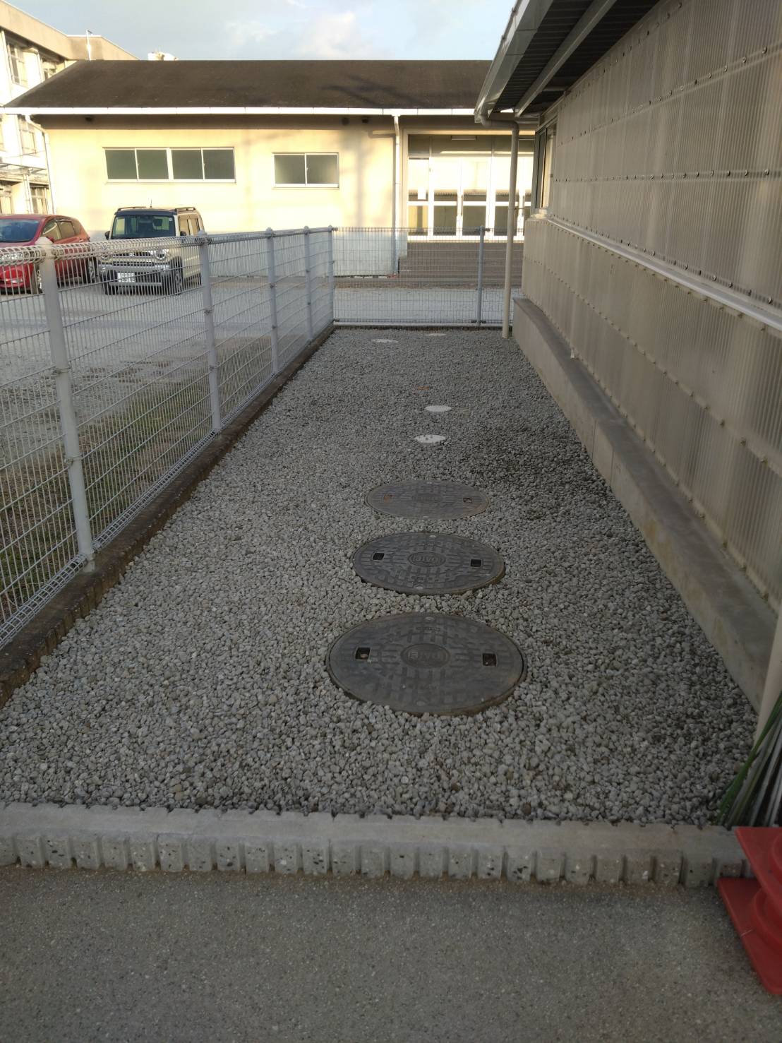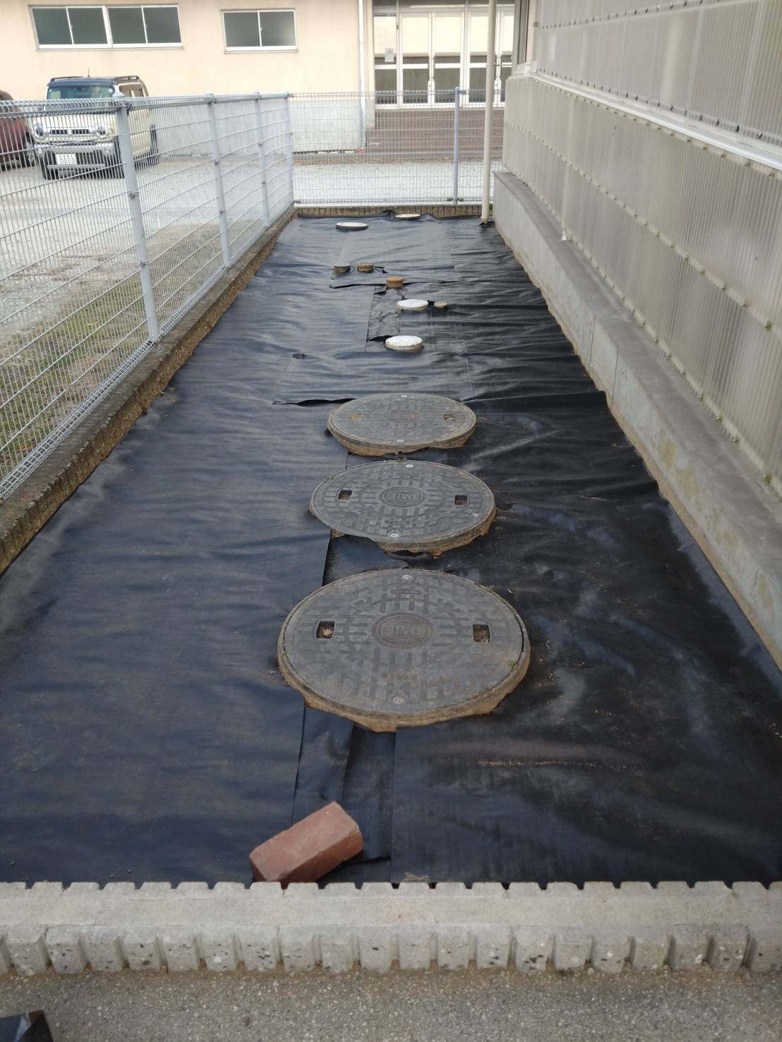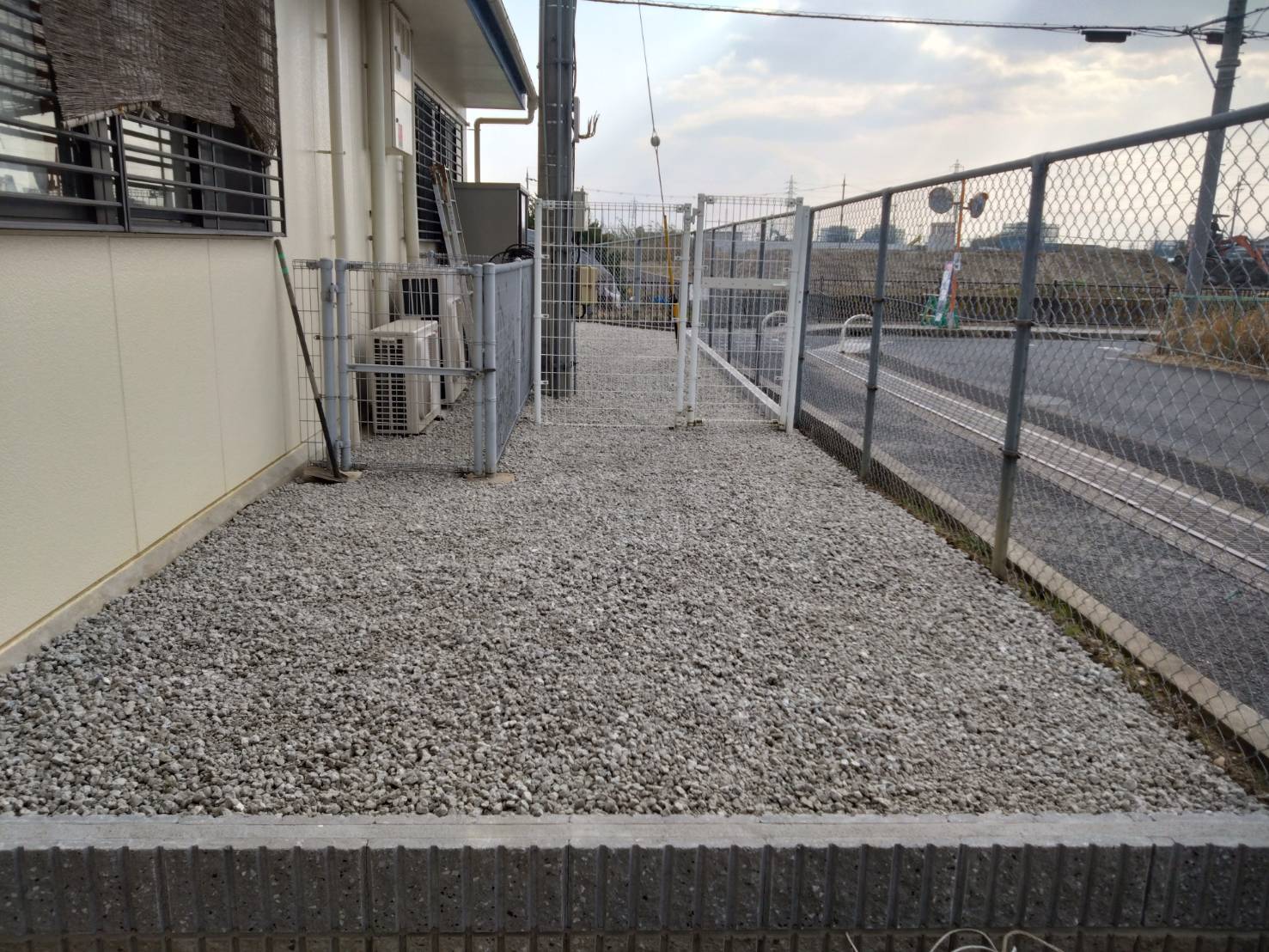 前回は、下地の整地と鋤取りでしたが、今回は、防草シートを張り、砕石敷です。